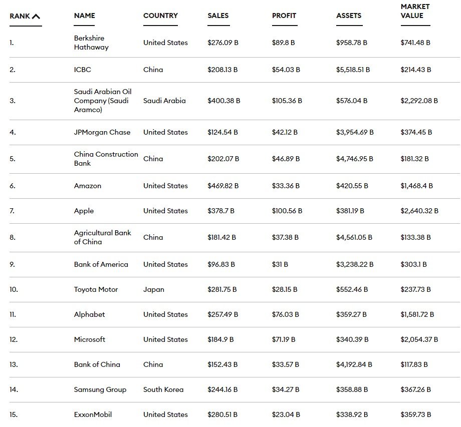 رقیب سنتی سامسونگ یعنی اپل وضعیت بسیار خوبی دارد. این شرکت توانست امسال چیزی در حدود ۳۷۸٫۷ میلیارد دلار فروش داشته باشد و با ارزش حیرت‌انگیز ۲٫۶ تریلیون دلار در رده‌ی نخست قرار بگیرد. ارزشی که بعید به نظر می‌رسد شرکتی جز مایکروسافت بتواند در آینده‌ای نزدیک به آن دست پیدا کند. اپل در مقایسه با سال گذشته، حدود ۲۹٪ از لحاظ فروش و ۱۳٪ از لحاظ ارزش رشد داشته است. هرچند این شرکت از لحاظ سوددهی، دیگر در رده‌ی نخست قرار ندارد و شرکت‌هایی نظیر آرامکو (شرکت نفتی عربستان) و آمازون را بالاتر از خود می‌بیند.